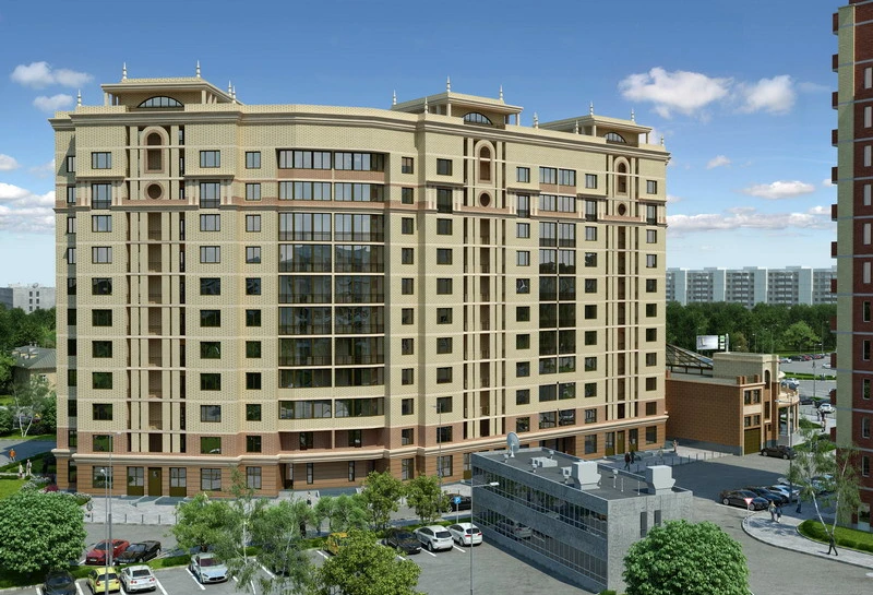 В комплекс входит одно трехсекционное здание, высота которого составляет 11 этажей. Для внешней отделки застройщик выбрал кирпич и керамогранитную плитку.