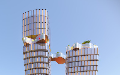 Особенностью проекта будет остекленный мост в форме “живой” волны, соединяющий две башни между собой на высоте 16 этажа. На этом мосту будет приватный зеленый сад.