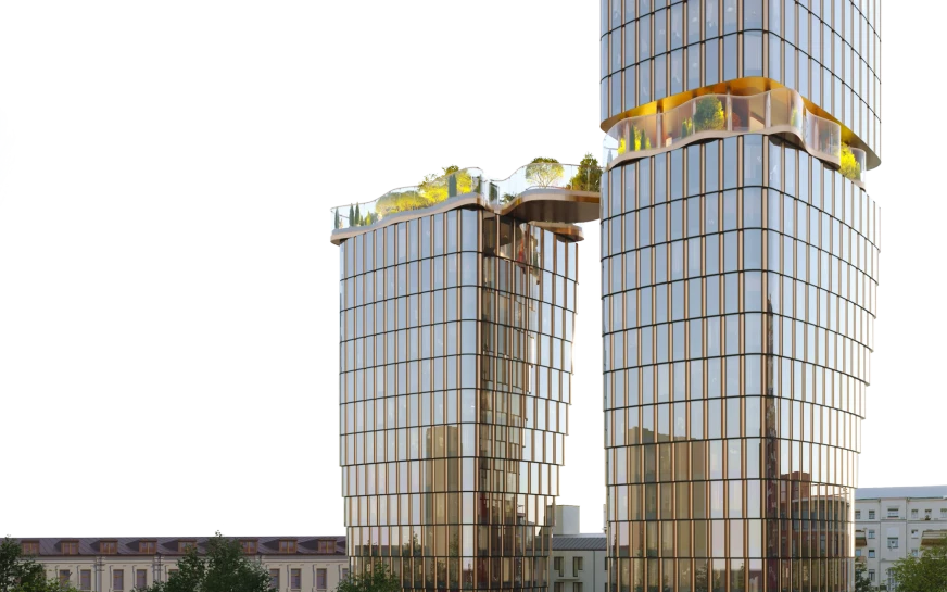 Особенностью проекта будет остекленный мост в форме “живой” волны, соединяющий две башни между собой на высоте 16 этажа. На этом мосту будет приватный зеленый сад.