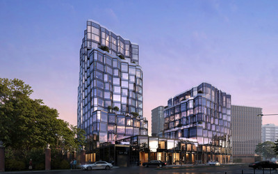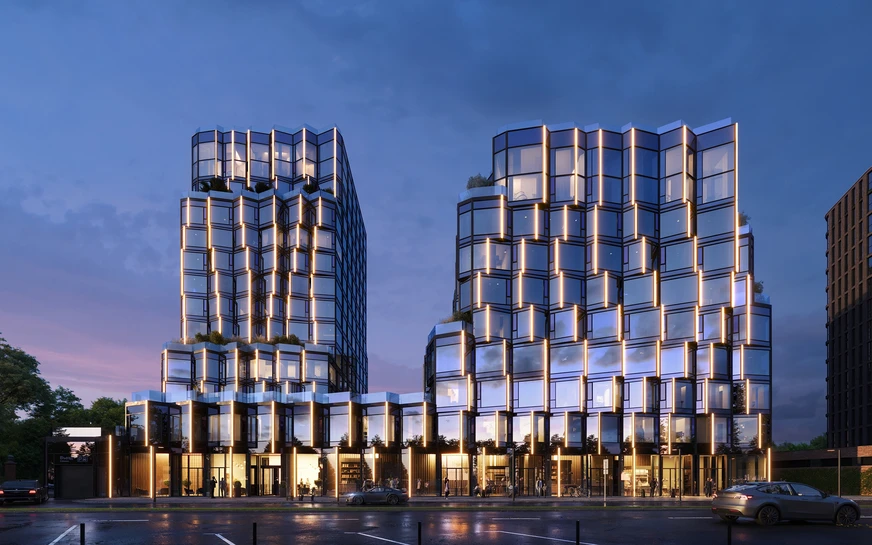 Проект разработан именитым бюро “APEX”. Ступенчатая форма 15-этажной секции отлично сочетается с камерной 9-этажной. Они объединены между собой двухуровневым стилобатом с клубными и общественными пространствами.