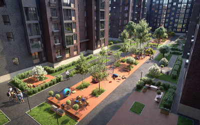 Концепция дворов устроена очень удобно и прагматично. Предусмотрены спортивные площадки, стрит-ритейл и красивые зоны отдыха для семей с детьми.