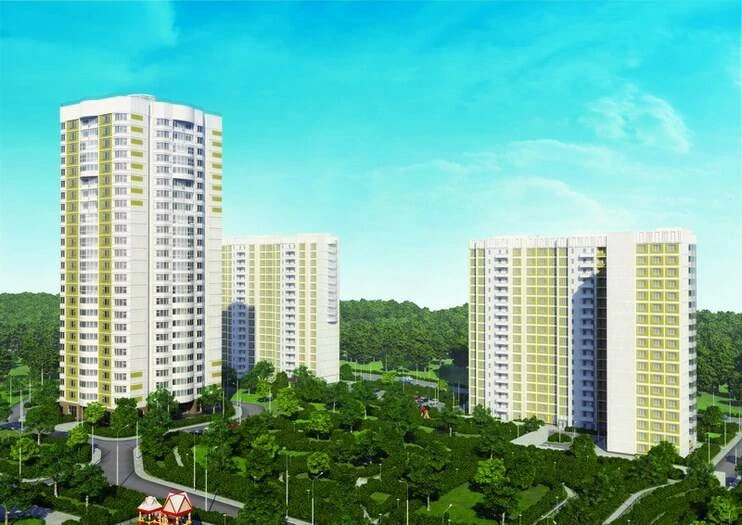 Комплекс представляет собой три новостройки, высота которых колеблется от 18 до 25 этажей. Благодаря панельной технологии строительство ЖК был реализован максимально быстро.