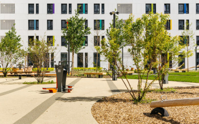 Придомовая территория благоустроена и озеленена. В "Green Park" имеются спортивные и детские площадки, зоны отдыха. Также в центре квартала находится фонтан и сквер для приятного времяпровождения