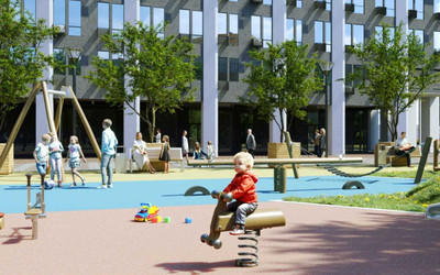 Застройщик позаботился об озеленении территории. Кроме того, рядом с домом появятся детские и спортивные площадки.