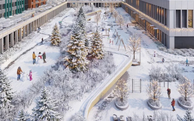 В закрытом внутреннем дворе площадью 8000 м2 обустроены три детские площадки и воркаут‑зона. По периметру двора, на втором уровне, идет променад – ещё одно зелёное пространство с местами для отдыха и работы.