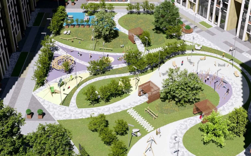 На придомовой территории появятся зоны для занятий воркаутом, детские и спортивные площадки и прогулочные площадки. Кроме того, на территории есть Wi-Fi.