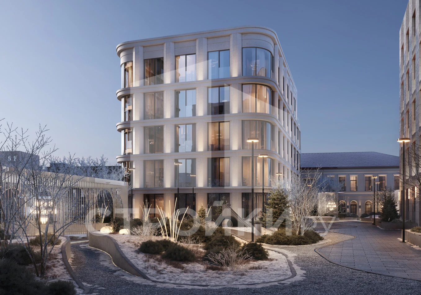 4 клубных корпуса на 1 га приватной территории с закрытым зелёным сквером, дизайнерскими ландшафтами и видами на воду. Архитектура в стиле метамодернизма, фасады с медными акцентами, панорамное остекление и высокие потолки. Концепция “тихой роскоши” — натуральные материалы, дизайнерская мебель, продуманные детали.
