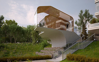 Внутреннее пространство комплекса объединяет ландшафтный парк, который занимает почти половину всей территории – 2 га