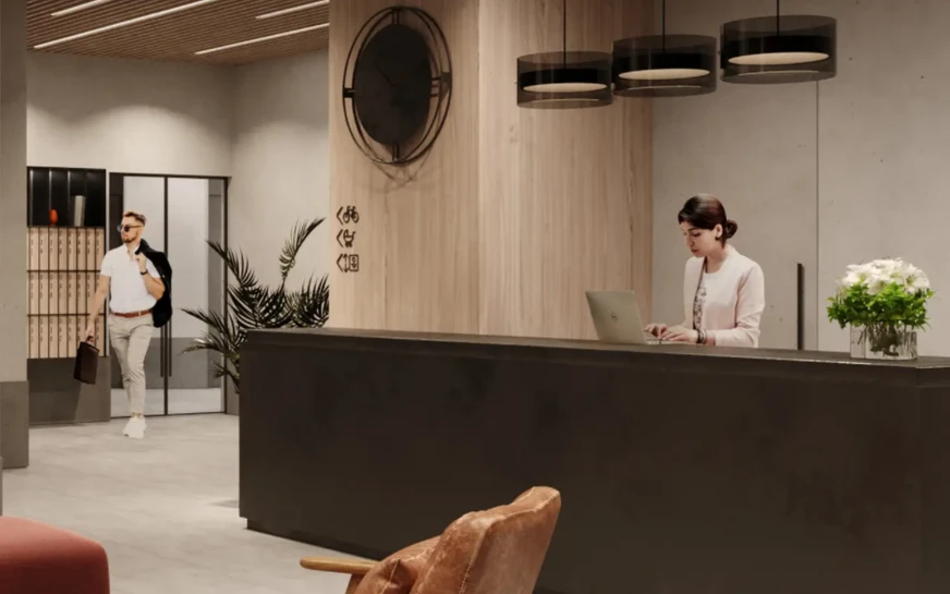 Лобби отделаны в стиле лофт. В комплексе появятся зоны с мягкой мебелью для ожидания гостей, помещения для колясок и велосипедов, лапомойки для домашних животных, гостевые санузлы и т.д.
